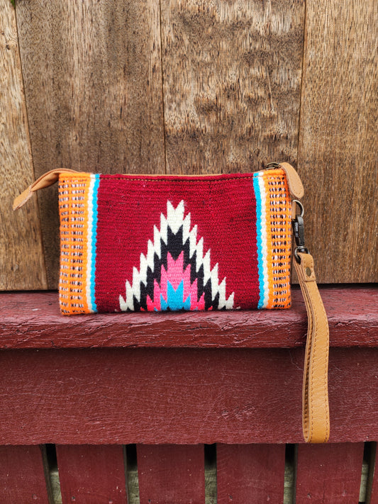 Tooled Saddle blanket clutch - Burgundy/Orange/sky blue